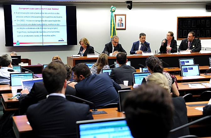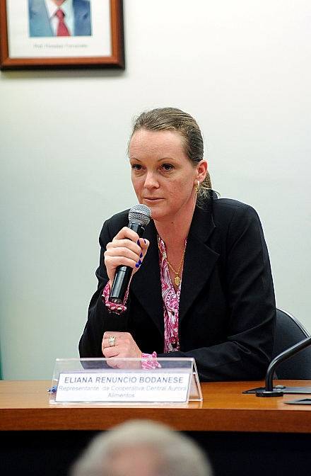 Mais informações Audiência pública para esclarecer sobre a criação, manejo, transporte e abate de animais para consumo, e políticas públicas de bem-estar animal no setor produtivo. Representante da Cooperativa Central Aurora Alimentos, Eliana Renuncio Bodanese