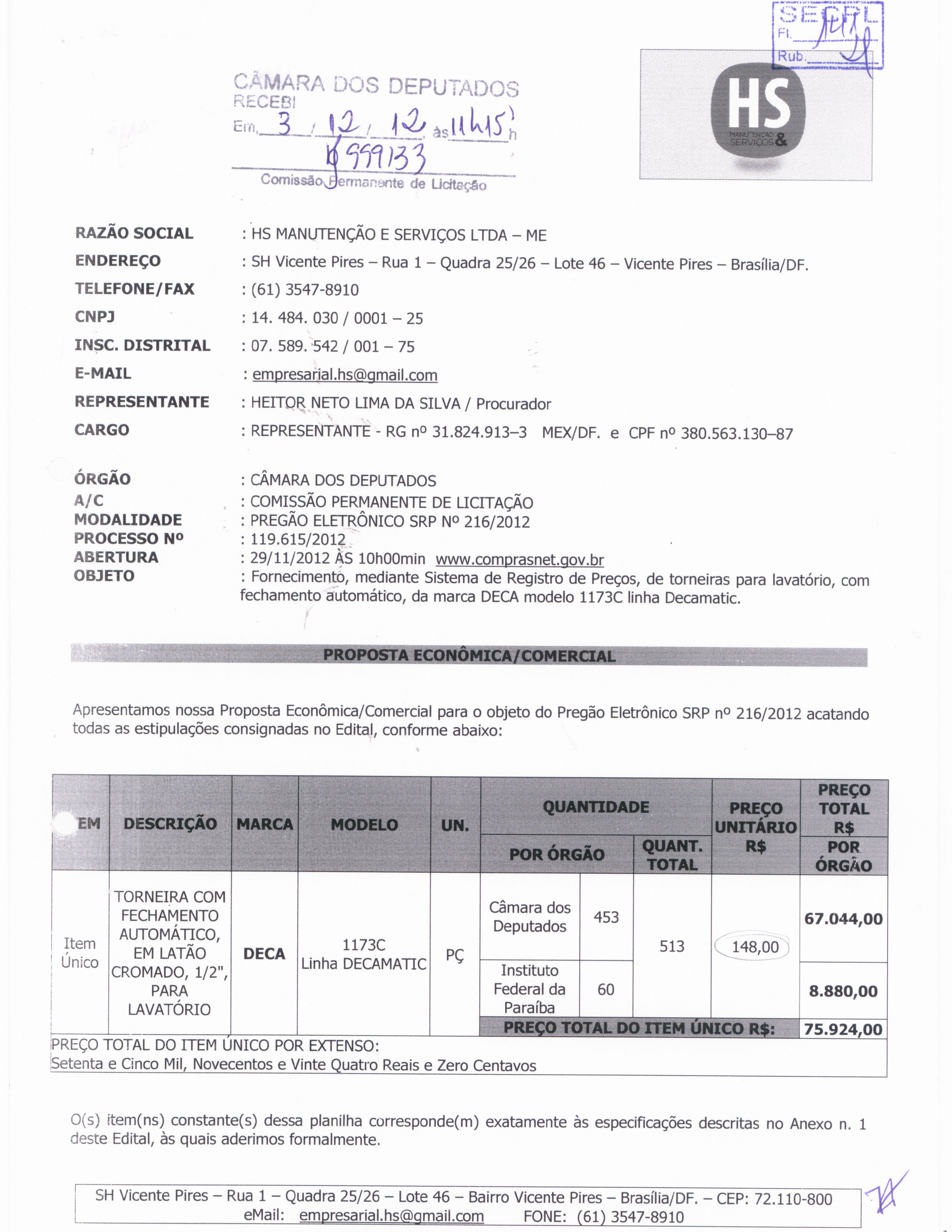 | Item: 1 | Descrição: TORNEIRA COM FECHAMENTO AUTOMÁTICO, EM LATÃO CROMADO, 1/2", PARA LAVATÓRIO | Quantidade: 453 (PEÇA) | Valor Unitário: R$ 148,00 | Valor do item: R$ 67.044,00 |