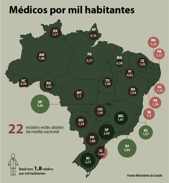 Em sua apresentação, o ministro afirmou que o Brasil tem 1,8 médicos por mil habitantes. Apesar de, segundo ele, não haver parâmetros recomendados pela Organização Mundial de Saúde (OMS), em comparação o Brasil tem menos densidade de médicos do que Argentina e Uruguai, além de vários países europeus, ressaltou. E 700 municípios não têm sequer um médico residindo no local.