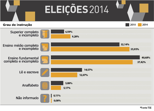Outro dado relevante é o aumento da escolaridade do eleitor brasileiro, em comparação com as eleições de 2010. Apesar de a maior parte do eleitorado ainda ter baixa escolaridade – 30,2% tem apenas ensino fundamental incompleto –, aumentou o percentual de eleitores com ensino médio completo e incompleto e com superior completo e incompleto.